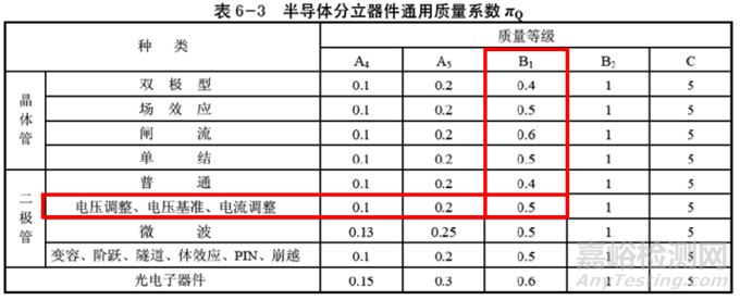查 GJB/Z 299C-2006中的表6.3,確定調(diào)整二極管的質(zhì)量系數(shù):πQ1 = 0.5;同樣的方法(查表6-4),確定合成電阻器的質(zhì)量系數(shù):πQ2 = 0.6;云母電容器的質(zhì)量系數(shù):πQ3= 0.5。