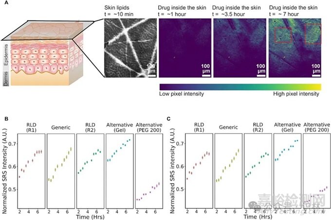對于應(yīng)用于皮膚的外用藥品,生物等效性(BE)通常是基于可比性臨床終點(diǎn)研究來確定的。 但是,此類研究昂貴且耗時(shí),可能涉及數(shù)百至數(shù)千名患者,研究終點(diǎn)需要數(shù)周至數(shù)月才能顯現(xiàn)。為了評估外用藥品BE研究的更具創(chuàng)新性和成本效益的科學(xué)有效方法,F(xiàn)DA 藥物審評與研究中心(CDER)的研究人員以及麻省總醫(yī)院,哈佛醫(yī)學(xué)院和麻省理工學(xué)院的研究人員進(jìn)行了首次同類研究[1],評估使用無創(chuàng)受激拉曼散射顯微鏡(SRS)評估外用產(chǎn)品生物利用度和 BE。該研究建立了初步可行性以及在實(shí)施SRS評估外用產(chǎn)品生物利用度和BE測量時(shí)提高可靠性和專屬性的方法。