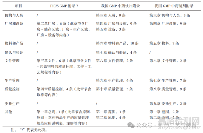 PIC/S GMP附錄7與我國GMP中藥制劑附錄、中藥飲片附錄的整體對比情況見表1。由于《中國藥典》中涉及的情況多為質(zhì)量控制相關(guān)內(nèi)容,因此未在表1中進行對比。