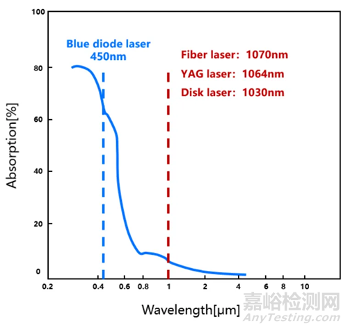 由于銅在常溫下對近紅外激光的吸收率非常低,所以在焊接過程中會將大部分入射激光反射掉,導致銅在激光焊接過程中的能量損耗嚴重、激光能量利用率低。同時,由于銅具有良好的導熱性,導致其在激光焊接的過程中穩(wěn)定性較差。上述因素使得銅在采用紅外激光焊接時必須使用高亮度激光器才能獲得相對優(yōu)良的焊接質量。但仍然避免不了焊縫成形差、熱裂紋、飛濺、氣孔等焊接等問題的產(chǎn)生,這些因素都極大限制了銅激光焊接技術的推廣應用。