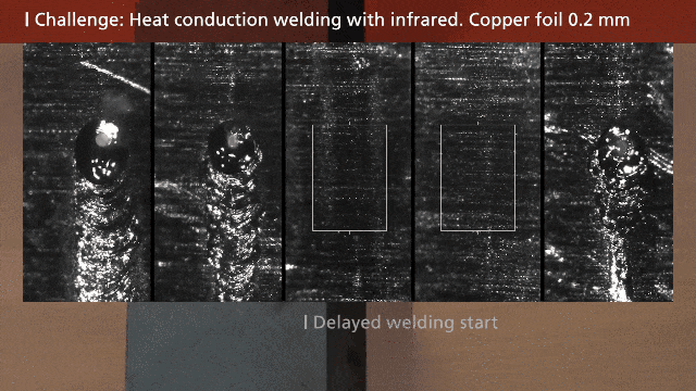 如「圖4 紅外激光焊接銅時產(chǎn)生頭部虛焊」所示,由于銅的高導熱及對激光的低吸收率,往往導致起始位置有一段會出現(xiàn)這樣的現(xiàn)象:起始段無法有效形成熔池,甚至沒有任何加熱印記,隨著溫度逐漸升高,開始形成熔池,造成起始部分“虛焊”。