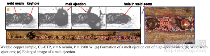 采用紅外激光對銅進行直線焊接,具有不穩(wěn)定的工藝窗口和最大的熔深波動,容易產(chǎn)生如圖1所示的飛濺(spatter)、熔融金屬噴濺(melt ejection)、孔洞(hole)等缺陷。