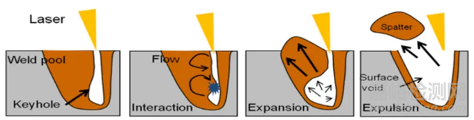 如「圖9 銅激光焊接匙孔狀態(tài)模擬」所示,可以清晰看到由于銅焊接過程不穩(wěn)定所導致的飛濺和氣孔,這兩種缺陷在銅的激光焊接過程最為常見。這里簡要概述一下: