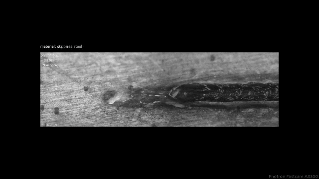 如「圖8 飛濺形成高速攝影 」所示,深熔焊時,急劇上升的激光吸收率(60%)使得熔池內部蒸發(fā)量劇增,出現(xiàn)飛濺,造成匙孔坍塌,然后激光又打在熔池上,吸收率又從60%降低到20%左右,隨后又隨著蒸發(fā)量增加重新形成新的匙孔,激光吸收率增加,如此往復。劇烈的熱輸入波動會導致銅在熱導焊和深熔焊周期性變化,出現(xiàn)熔深交替深淺的情況,使得 熔深不可控。如圖所示,會有部分區(qū)域熔深不足,同時會導致銅金屬蒸汽蒸發(fā)量劇烈變化,使得匙孔內部周期性坍塌閉合,形成氣孔和飛濺。
