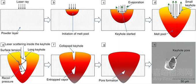 但是在1250~1350K這個極小的溫度區(qū)間,純銅對光的吸收率突然“跳躍”到了15%左右;與此同時,其熱導率也由原來的330W/mK陡降到160W/mK左右。這使得在激光束功率密度相同的情況下,液態(tài)熔池內的熱積累速度瞬間飆升數(shù)倍。此時液態(tài)銅吸收大量熱量溫度進一步升高(2500°C以上),產(chǎn)生劇烈蒸發(fā)形成“匙孔(keyhole)”,一旦形成“匙孔效應”,入射激光在匙孔內部多次反射吸收,激光吸收率飆升到60%左右,進一步加劇了內部材料的加熱和蒸發(fā),如此巨大的熱輸入波動會導致銅熔池劇烈波動,造成熔池內部“微爆”和小孔坍塌現(xiàn)象,產(chǎn)生飛濺、氣孔等缺陷。