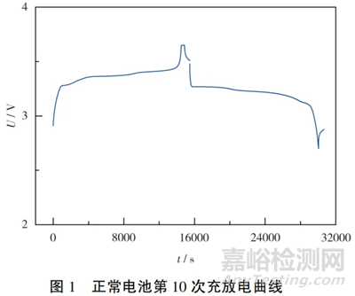 第一組正常電池中單體電池的放電曲線如圖1所示。隨后在正常電池組和異常電池組中各取1只單體電池進(jìn)行電性能測試,發(fā)現(xiàn)異常電池明顯鼓脹,電壓均下降至0V,內(nèi)阻由3.63Ω上升至4.69Ω,該組電池全部失效,而正常電池的電壓為3.27V。