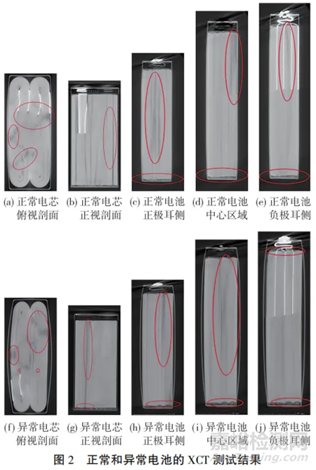 正常、異常電池的XCT無損檢測結(jié)果見圖2。正常電池的電芯外殼厚度約為0.5mm,電芯未見明顯脹氣,電芯極卷與兩側(cè)殼體間距貼合度較好。從電芯俯視剖面圖[圖2(a)]可見明顯的極片褶皺,局部區(qū)域極片有一定程度的彎曲變形。