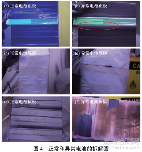 分別對正常和異常電池進(jìn)行拆解,拆解后的正極、負(fù)極和隔膜見圖4。正常電池使用一段時間后,雖然正、負(fù)極片均出現(xiàn)了較嚴(yán)重的褶皺,但正極、負(fù)極和隔膜保持較好,活性物質(zhì)還能較好地粘附在集流體上,負(fù)極片嚴(yán)重褶皺區(qū)域和卷芯彎折區(qū)域有大小不同的黑色發(fā)散條紋,局部區(qū)域存在析鋰現(xiàn)象。