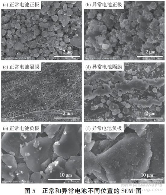 正常、異常電池不同位置的SEM圖見圖5。正常電池的正極表面[圖5(a)]可清楚觀察到磷酸鐵鋰活性物質(zhì)和導(dǎo)電炭黑顆粒;隔膜表面[圖5(c)]可清楚觀察到隔膜上的孔隙結(jié)構(gòu);負(fù)極表面[圖5(e)]也可觀察到石墨活性物質(zhì)顆粒及一定量的其他沉積物質(zhì)。