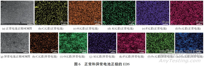 為了分析異常區(qū)域的材料組分,并進(jìn)一步確定電池失效的原因,分別對正常電池、異常電池的正極和負(fù)極進(jìn)行EDS測試。正極的EDS結(jié)果如圖6所示,負(fù)極的EDS結(jié)果如圖7所示。從圖6可知,正常電池的正極表面元素均為O、C、P、Fe和Al,沒有檢測到Cu元素,而在異常電池的正極表面檢測到了Cu元素。