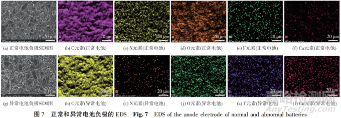 從圖7可知,正常、異常電池的負(fù)極表面均存在少量的Cu元素。正常電池表面的Cu元素較少,信號集中于集流體背底,異常電池表面的Cu元素較多,表明過放電情況下,集流體的Cu擴(kuò)散到了負(fù)極表面,并進(jìn)一步向隔膜和正極表面遷移。正常、異常電池的負(fù)極表面均存在一定含量的N、F沉積物質(zhì),來源主要是負(fù)極表面的SEI膜。