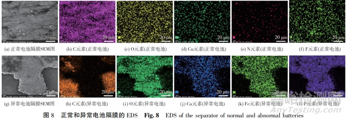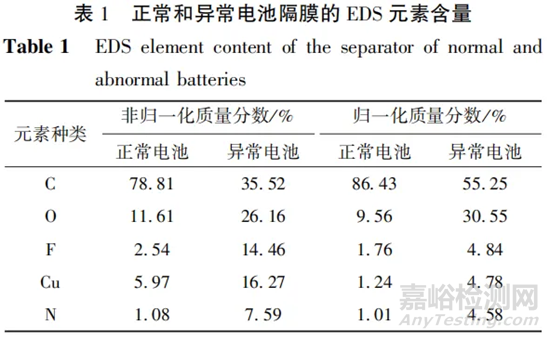 正常和異常電池隔膜(負(fù)極側(cè)面)的EDS結(jié)果見圖8。從圖8可知,正常電池表面沉積物含有一定量的C、O、F、Cu和N,主要是電池正常老化產(chǎn)生的,含量見表1。