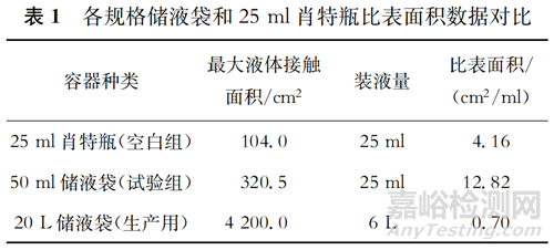 1.4.1 各容器比表面積對(duì)比 由表1可見,50 ml儲(chǔ)液袋的比表面積最大,為12.82 cm2/ml,處于最具有挑戰(zhàn)性的試驗(yàn)環(huán)境中,而實(shí)際生產(chǎn)中使用的20 L儲(chǔ)液袋的比表面積為0.70 cm2/ml,僅為50 ml儲(chǔ)液袋比表面積的約1/18。將50 ml儲(chǔ)液袋作為浸出物試驗(yàn)的樣品袋,得出的試驗(yàn)結(jié)論最具有代表性和權(quán)威性,對(duì)于判定實(shí)際生產(chǎn)的安全性更可靠。