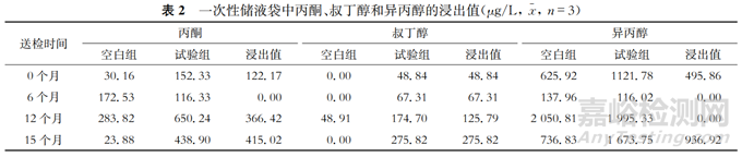 由表2可見,到部分節(jié)點(diǎn)后數(shù)據(jù)呈現(xiàn)負(fù)增長(zhǎng),而浸出值的負(fù)增長(zhǎng)并不一定是一次性儲(chǔ)液袋中浸出物含量的減少。測(cè)試樣品在0—15個(gè)月的保存周期中(該測(cè)試周期已覆蓋腮腺炎病毒原液12個(gè)月的保存周期),丙酮、叔丁醇和異丙醇均于15個(gè)月時(shí)出現(xiàn)檢出最高峰,浸出物含量分別達(dá)到415.02、275.82和936.92 μg/L,可以判斷在整個(gè)保存周期中丙酮、叔丁醇和異丙醇的浸出物含量呈現(xiàn)波動(dòng)增加的趨勢(shì),雖然在中間部分檢測(cè)節(jié)點(diǎn)出現(xiàn)了未增長(zhǎng)的情況,但在保存至15個(gè)月的最終檢測(cè)節(jié)點(diǎn)時(shí),丙酮、叔丁醇和異丙醇的浸出值與0個(gè)月的浸出值相比均大幅增長(zhǎng)。從整個(gè)保存周期和檢測(cè)周期判斷丙酮、叔丁醇和異丙醇3種物質(zhì)的浸出值是有所上升的(見表2)。