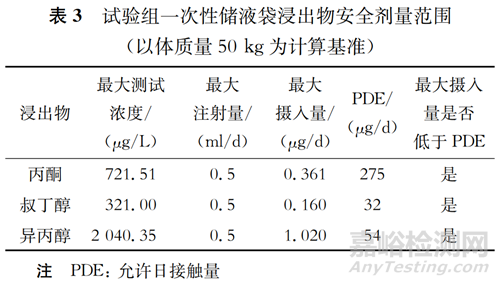 由于丙酮、叔丁醇和異丙醇作為提取研究中確定的研究成分,均存在吸附和蒸發(fā)作用的影響,因此檢測(cè)周期中浸出物檢出的數(shù)值未必一定會(huì)隨著保存時(shí)間增加而增加,本次試驗(yàn)組的一次性儲(chǔ)液袋為加蓋密閉容器并在蓋子處纏繞絕緣膠帶進(jìn)行密閉保護(hù),在進(jìn)行檢測(cè)前不進(jìn)行任何拆卸外包的動(dòng)作,檢測(cè)過程中也進(jìn)行樣品的搖勻,最大程度避免了吸附和蒸發(fā)作用對(duì)本次試驗(yàn)的容器影響,檢測(cè)數(shù)據(jù)可信度高。