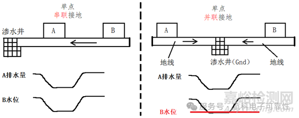 單點(diǎn)串并聯(lián)是一種接地結(jié)構(gòu)問題(如圖示意)。類比說明一下,加入A是包子鋪、B是理發(fā)店,兩家都排廢水,水井很厲害多少水來了都可以快速排掉。