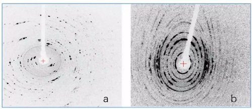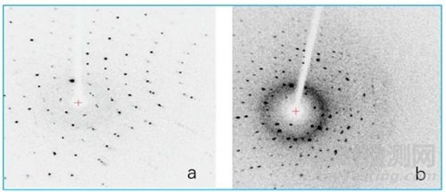 在顯微鏡下挑選或切割到形貌好的晶體后,并不表明這顆晶體就是高質(zhì)量的晶體,判斷晶體質(zhì)量最終要看晶體的衍射情況。晶體衍射照片中每個黑點代表一個衍射點,黑點的大小和黑度表示衍射強度,點越大越黑表明衍射越強。