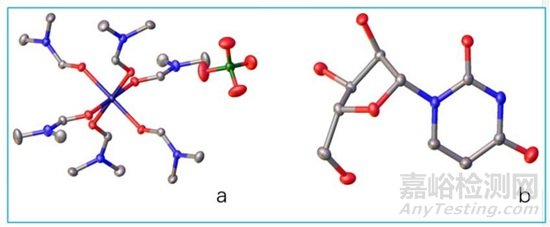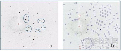 當然并不是所有的孿晶都不能進行單晶結(jié)構(gòu)測試解析,兩顆單晶形成的孿晶樣品,如果兩套衍射點不重疊(如圖4 所示 a 照片是衍射照片,b 照片是其積分照片。),程序能把兩套衍射點分開,雖然指標化率會較低,但是能得正確的晶胞參數(shù),衍射數(shù)據(jù)質(zhì)量也會不錯,結(jié)構(gòu)解析時再做一下孿晶處理,最后也能得到很好的單晶結(jié)構(gòu)數(shù)據(jù)。
