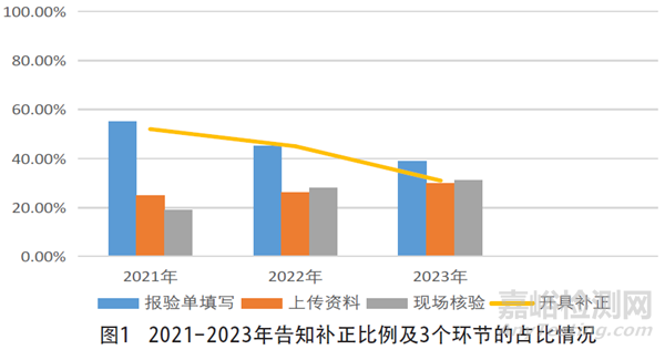 3年來,“備案”告知補(bǔ)正比例依次為52%、45%和31%,根據(jù)3個(gè)環(huán)節(jié)在年度的占比情況進(jìn)行橫向?qū)Ρ?,?bào)驗(yàn)單填寫情況逐漸改善,上傳資料、現(xiàn)場驗(yàn)證環(huán)節(jié)問題略有升高(見圖1)。
