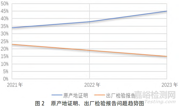 企業(yè)通過單一窗口填報(bào)基本信息后,需上傳隨附資料,其中,原產(chǎn)地證明(Certificate Of Origin,COO)、出廠檢驗(yàn)報(bào)告(Certificate OfAnalysis,COA)、貿(mào)易資料/質(zhì)量標(biāo)準(zhǔn)和說明書、包裝標(biāo)簽發(fā)生問題居多,又以原產(chǎn)地證明和出廠檢驗(yàn)報(bào)告資料出現(xiàn)問題更為突出,兩項(xiàng)約占總問題的55%(具體見圖2)。