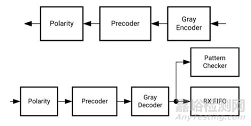 PAM4 QPRBS/PRBSQ pattern是基于OIF2014.230 CEI-56G-VSR-PAM4 specification and IEEE Std P802.3bs。GTM的PAM4的調(diào)制,PRBS經(jīng)過了Gray Encoder和Precoder,以及Polarity三個模塊,接收時通過Polarity,Precoder和Gray Decoder。