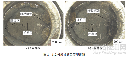 1,2號螺栓斷口宏觀形貌如圖2所示。由圖2可知:從裂紋源逐漸開始出現(xiàn)到擴展區(qū)域的撕裂棱線狀微條紋,沿著裂紋擴展方向最終出現(xiàn)小角度傾斜的斷裂面;其中1號螺栓疲勞源處有兩個半圓形區(qū)域,顏色與基體斷裂面有明顯差異;進(jìn)一步觀察發(fā)現(xiàn)整個斷口的近外圓處還有多處分布著無規(guī)律的半圓形區(qū)域;2號螺栓的斷口疲勞源區(qū)及與該疲勞源相對應(yīng)的近外圓處也有與上述半圓形區(qū)域類似的異常區(qū)域;兩件斷裂螺栓的斷口均呈明顯的脆性斷裂特征,除斷口外,螺栓邊緣耦合處高點有少量磨損和磕碰。