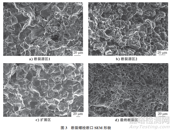 將斷裂的飛輪螺栓用超聲波清洗后,采用掃描電鏡對螺栓斷口進(jìn)行觀察,結(jié)果如圖3所示。由圖3可知:1 號螺栓斷裂源處兩個半圓形區(qū)域的微觀形貌顯示裂紋沿晶界擴展,沿晶斷口的形貌主要取決于金屬材料本身的晶粒形狀,沿晶斷口呈現(xiàn)明顯的冰糖狀[ 見圖3a)],并且局部出現(xiàn)“雞爪狀”形貌和二次裂紋擴展,且另外多處小半圓區(qū)域特征與之相同,也呈沿晶斷裂特征;2號螺栓斷裂源區(qū)及小半圓區(qū)域斷口也呈沿晶斷裂特征[ 見圖3b)];斷裂的大部分?jǐn)U展區(qū)域主要呈現(xiàn)沿晶斷口特征,斷裂面平整[ 見圖3c)];除以上區(qū)域外,在擴展區(qū)接近最終斷裂區(qū)域出現(xiàn)沿晶和韌窩混合形貌[ 見圖3d)]。隨著裂紋的擴展,兩件螺栓斷口在斷裂后期出現(xiàn)韌窩形貌,說明斷裂初期為脆性斷裂,由于最終斷裂的區(qū)域產(chǎn)生韌性斷裂,因此斷裂表面出現(xiàn)部分韌窩,最終韌性斷裂區(qū)域較少,韌窩形貌不明顯。