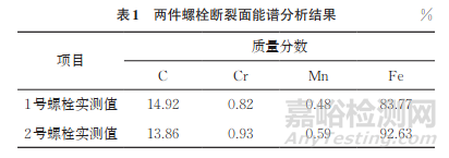 對兩件螺栓的斷裂面進(jìn)行能譜分析,結(jié)果如表1所示。由表1可知:螺栓斷面不存在異常元素。
