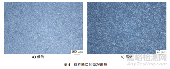 在1,2 號螺栓斷口位置截取并制備金相試樣,用體積分?jǐn)?shù)為3%~5%的硝酸乙醇溶液對試樣進(jìn)行腐蝕,再將試樣置于光學(xué)顯微鏡下觀察,結(jié)果如圖4所示。由圖4可知:螺栓的顯微組織細(xì)小,未發(fā)現(xiàn)異常非金屬夾雜物。螺栓的斷裂區(qū)域顯微組織未發(fā)現(xiàn)異常情況,與其他正常區(qū)域組織相同,均為回火索氏體。
