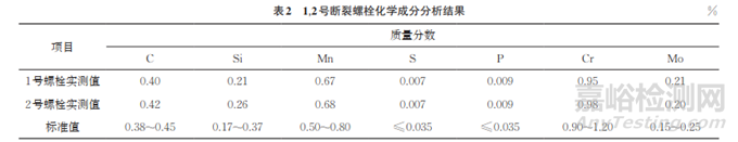 在1,2 號螺栓斷口附近截取試樣,用直讀光譜儀對試樣進(jìn)行化學(xué)成分分析,結(jié)果如表2所示。由表2可知:兩件斷裂螺栓的化學(xué)成分均符合GB/T 3077—2015對42CrMo鋼的要求。