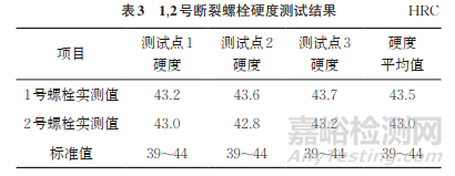 在1,2號斷裂螺栓上截取試樣,對試樣進(jìn)行洛氏硬度測試,結(jié)果如表3所示。由表3可知:斷裂螺栓的硬度符合GB/T 3098.1—2010對12.級螺栓的洛氏硬度要求,但結(jié)果接近標(biāo)準(zhǔn)要求的上限。