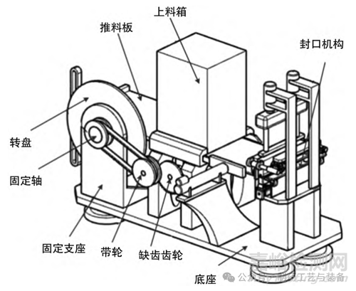 藥品包裝用復(fù)合膜封邊裝置中上料機(jī)構(gòu)主要由固定座、轉(zhuǎn)盤、一字滑槽架、推料板、帶輪、傳動(dòng)帶、轉(zhuǎn)動(dòng)軸以及齒輪和電機(jī)等組成[5]。