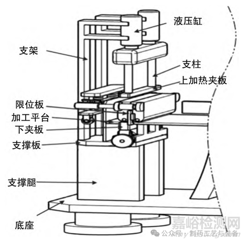 藥品包裝用復(fù)合膜封邊裝置中封口機(jī)構(gòu)主要由支撐腿、支撐板、支撐塊、支架、液壓缸、加熱箱、支撐柱、加熱夾板、限位板以及加工平臺(tái)等組成。
