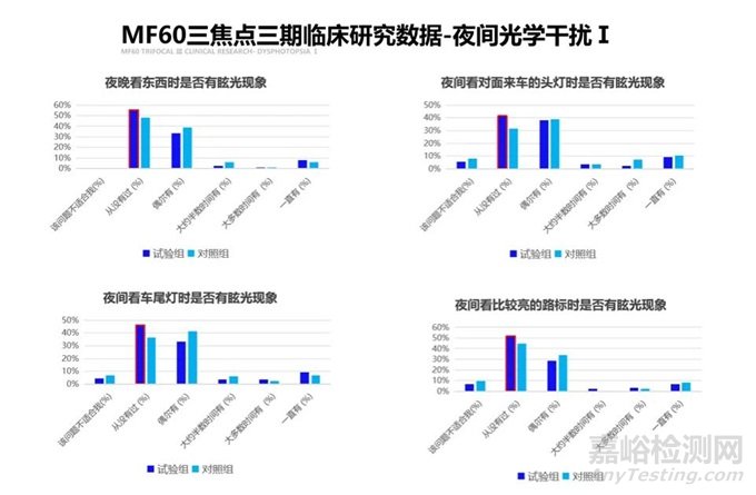在視覺質(zhì)量滿意度問卷中,通過13個(gè)問題對常見的夜間光學(xué)干擾進(jìn)行調(diào)查,結(jié)果表明:在夜間光學(xué)干擾方面、生活舒適感方面、MF60“從沒有過”的百分比絕對值均表現(xiàn)優(yōu)異,甚至在“眼睛周圍或眼內(nèi)是否有酸痛感或疲勞感”方面具備統(tǒng)計(jì)學(xué)差異的優(yōu)異表現(xiàn)。