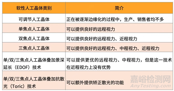 人工晶體是用聚合物材料制成的能夠植入眼內(nèi)的人工透鏡,用于取代白內(nèi)障手術(shù)中被摘除的天然晶狀體。根據(jù)材質(zhì)可分為硬性人工晶體和軟性人工晶體。目前常見的軟性人工晶體又可分為:單焦點(diǎn)人工晶狀體、雙焦點(diǎn)人工晶狀體、三焦點(diǎn)人工晶狀體、人工晶狀體疊加景深延長技術(shù)、人工晶狀體疊加抗散光技術(shù)。