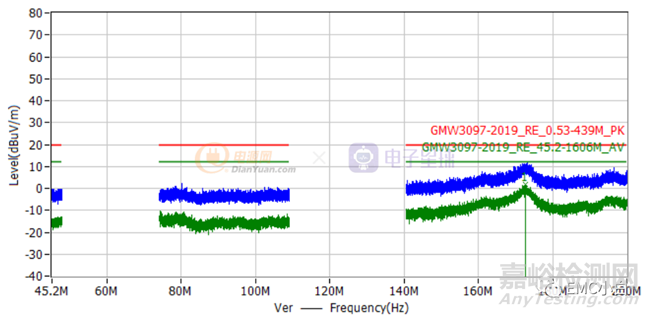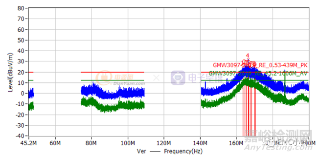 實驗現(xiàn)象:在進行RE輻射類實驗時,發(fā)現(xiàn)160MHz附近出現(xiàn)寬帶超標(biāo),但是之前實驗中并未發(fā)現(xiàn)該頻段超標(biāo)。