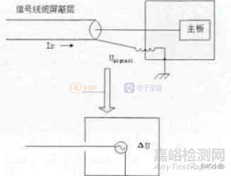 由于存在屏蔽層最后一段的“豬尾巴”,隨著頻率變高,該段阻抗越高,也就是說當(dāng)有信號通過耦合在屏蔽層形成回路時,該段阻抗高于屏蔽層的其他部分的阻抗,會在與地之間形成一個電勢差U,該電勢差的存在會通過其他返回路徑形成共模干擾,導(dǎo)致輻射超標(biāo)。