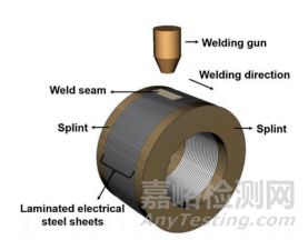 疊片鐵心熔焊的熱源包括激光、電子束、等離子弧、電弧(TIG、GTA、CMT)等。激光焊接作為一種高效、高質(zhì)量的熔焊工藝,被認(rèn)為是在高性能電機(jī)應(yīng)用中最具發(fā)展前途的一項(xiàng)工藝。與其他熔焊方法相比,激光焊接可以實(shí)現(xiàn)較小的熱影響區(qū),產(chǎn)生較低的殘余應(yīng)力,最終得到具有較高磁性能的焊接疊裝鐵心。圖3為疊片鐵心的激光焊接示意圖。運(yùn)動(dòng)能量束連續(xù)熔化疊層的邊緣,在界面處形成有效接頭。連接工藝的關(guān)鍵因素如下:(a)層的特殊結(jié)構(gòu)由數(shù)百片硅鋼疊片形成;(b)兩側(cè)的絕緣涂層,在動(dòng)態(tài)熔焊過程中會(huì)因?yàn)橥繉拥臒峤饪赡苷T發(fā)焊縫氣孔;(c)機(jī)械強(qiáng)度和磁性的綜合要求。
