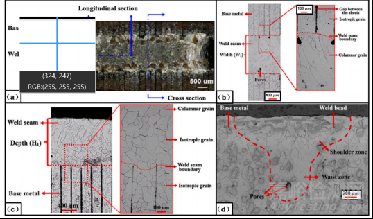 有研究人員分析了激光熔接焊縫的表面形貌和微觀結(jié)構(gòu),如圖4所示,焊縫表面質(zhì)量較好,無明顯缺陷。由于硅元素含量較高,即使它以高冷卻速率凝固,焊縫區(qū)仍然主要由鐵素體構(gòu)成。同時(shí)由于晶粒的外延生長(zhǎng),焊縫區(qū)出現(xiàn)柱狀晶粒向溫度梯度方向生長(zhǎng),在焊縫邊界附近的區(qū)域中觀察到細(xì)小的孔隙缺陷,這也為激光焊接頭表面和內(nèi)部的微觀結(jié)構(gòu)提供了一個(gè)認(rèn)識(shí)。