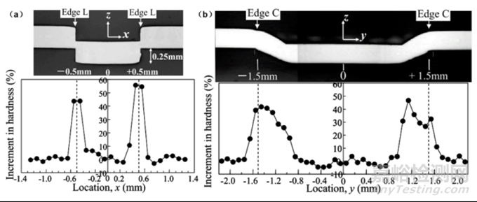 圖5 機(jī)械連接頭的橫截面圖和硬度分布(a)沿短邊方向;(b)沿長(zhǎng)邊方向;顯微硬度每0.1毫米測(cè)量一次