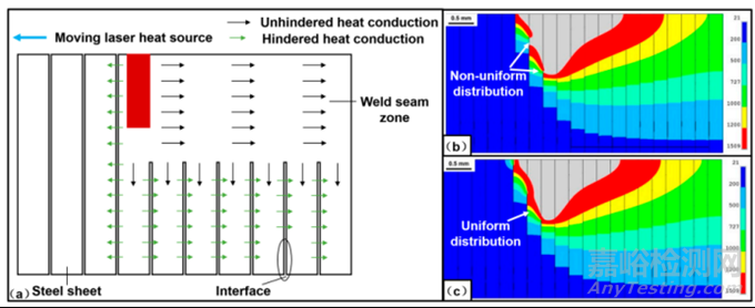 表6 (a)焊接過程中焊縫縱截面?zhèn)鳠徇^程原理圖;(b)模擬界面?zhèn)鳠嶙璧K焊縫縱截面溫度分布不均勻;(c)模擬界面吸收激光能量而熔化時(shí)焊縫縱截面溫度分布均勻
