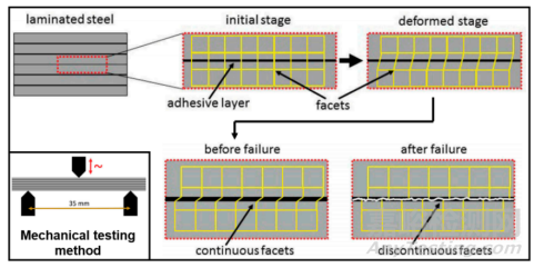 采用三點(diǎn)彎曲實(shí)驗(yàn)測(cè)量粘接鐵心的剪切強(qiáng)度,采用數(shù)字圖像相關(guān)法測(cè)量剪切斷裂應(yīng)變,該方法是評(píng)估粘合層壓材料機(jī)械性能的一種行之有效的方法,但它對(duì)于機(jī)械連接或熔焊連接不太適用,因?yàn)檫@兩種方法的連接區(qū)域較小。