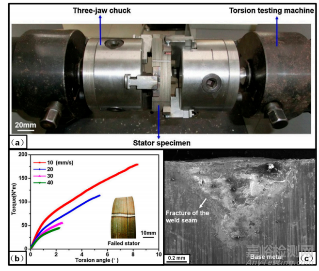 圖2(a)測(cè)量熔焊疊片鐵心扭轉(zhuǎn)特性的實(shí)驗(yàn)系統(tǒng);(b)激光焊疊片鐵心的扭轉(zhuǎn)特性;(c)斷裂的特征(此圖根據(jù)原始圖像重新編輯)
