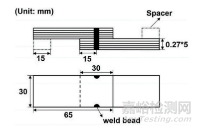 圖3 評(píng)估熔焊鐵心的搭接強(qiáng)度的試樣示意圖(在試樣兩側(cè)對(duì)稱設(shè)置焊縫,以保持平衡)