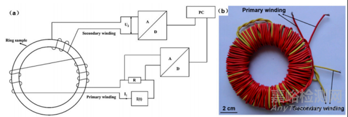 圖4測(cè)量磁性能的系統(tǒng):(a)示意圖;(b)卷繞鐵心樣品。