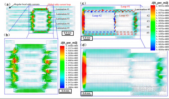 圖6(a)焊接鐵心原理圖;(b)替代磁場(chǎng)環(huán)境下焊接層截面的渦電流分布原理圖;(c)模擬非焊接層截面的渦流損失分布;(d)模擬焊接層截面的渦流損失分布。