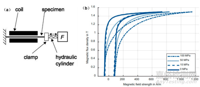 圖1 (a)在負(fù)載狀態(tài)下的磁性能測(cè)量原理;(b)M400-50A在50 Hz下不同拉應(yīng)力的磁滯回線