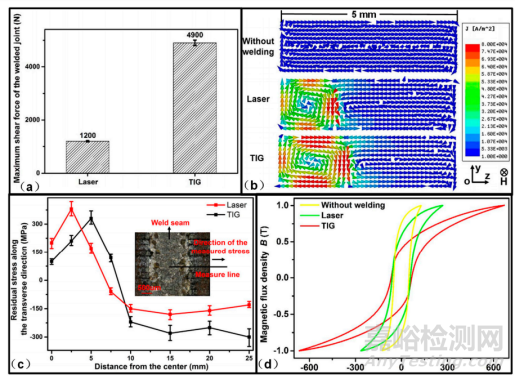 圖2 TIG焊接與激光焊接比較(a)最大抗剪力強(qiáng)度;(b)渦流分布;(c)殘余應(yīng)力分布;(d)磁滯曲線