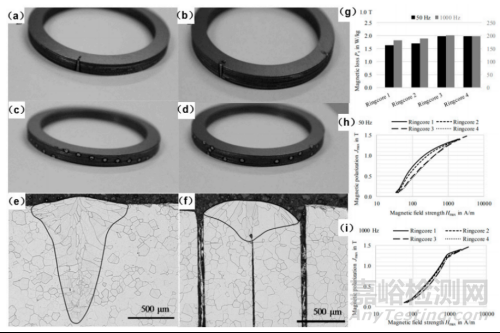 圖3 線焊層和點(diǎn)焊層之間的比較:(a)環(huán)形鐵心1,兩條線性焊接線;(b)環(huán)形鐵心2,四條線性焊接線;(c)環(huán)形鐵心3,螺旋形焊接點(diǎn);(d)環(huán)形鐵心4,焊點(diǎn)的統(tǒng)計(jì)分布;(e)線焊的橫截面;(f)點(diǎn)焊的橫截面;(g)50 Hz和1000 Hz時(shí)的鐵損以及1.0T的磁感應(yīng)強(qiáng)度。