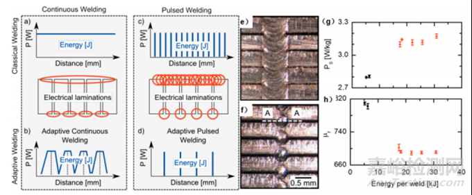 有研究人員開發(fā)了一種鐵心自適應(yīng)脈沖激光焊接新型技術(shù),如圖4所示,該項(xiàng)技術(shù)通過在線監(jiān)測(cè)鐵心層壓板之間的間隙位置,從而能夠在層壓板界面實(shí)現(xiàn)精準(zhǔn)焊接。實(shí)驗(yàn)結(jié)果表明,與工業(yè)生產(chǎn)中廣泛使用的傳統(tǒng)連續(xù)激光焊接相比,開發(fā)的脈沖點(diǎn)焊產(chǎn)生的特定功率損耗較低,并且提高了樣品的相對(duì)磁導(dǎo)率。質(zhì)量控制對(duì)于提高焊接質(zhì)量十分重要,可以將工藝監(jiān)測(cè)集成到焊接系統(tǒng)中,以控制質(zhì)量并相應(yīng)地優(yōu)化參數(shù)。光學(xué),光譜,熱和聲學(xué)傳感器越來越多地單獨(dú)或組合使用,這對(duì)于提高質(zhì)量控制十分有效。對(duì)于測(cè)量數(shù)據(jù)的評(píng)估,機(jī)器智能例如機(jī)器學(xué)習(xí)等都具有巨大的潛力。對(duì)于這些新型焊接技術(shù)的大規(guī)模應(yīng)用,對(duì)焊接質(zhì)量,微觀結(jié)構(gòu),機(jī)械性能和磁性能進(jìn)行全面研究非常重要。此外,還應(yīng)考慮焊接系統(tǒng)和每個(gè)定子的成本,以及焊接過程的可適用性和焊接系統(tǒng)的壽命。